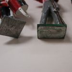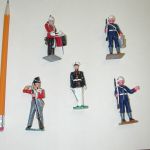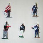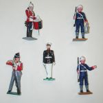 Set of 5- two have a hallmark of MT interlocked on bottom and two ahve hand engraved England with other markings that I can’t make out. One has no markings. I’m not sure what brand they are just thinking it may be Marx and the other two Britains.