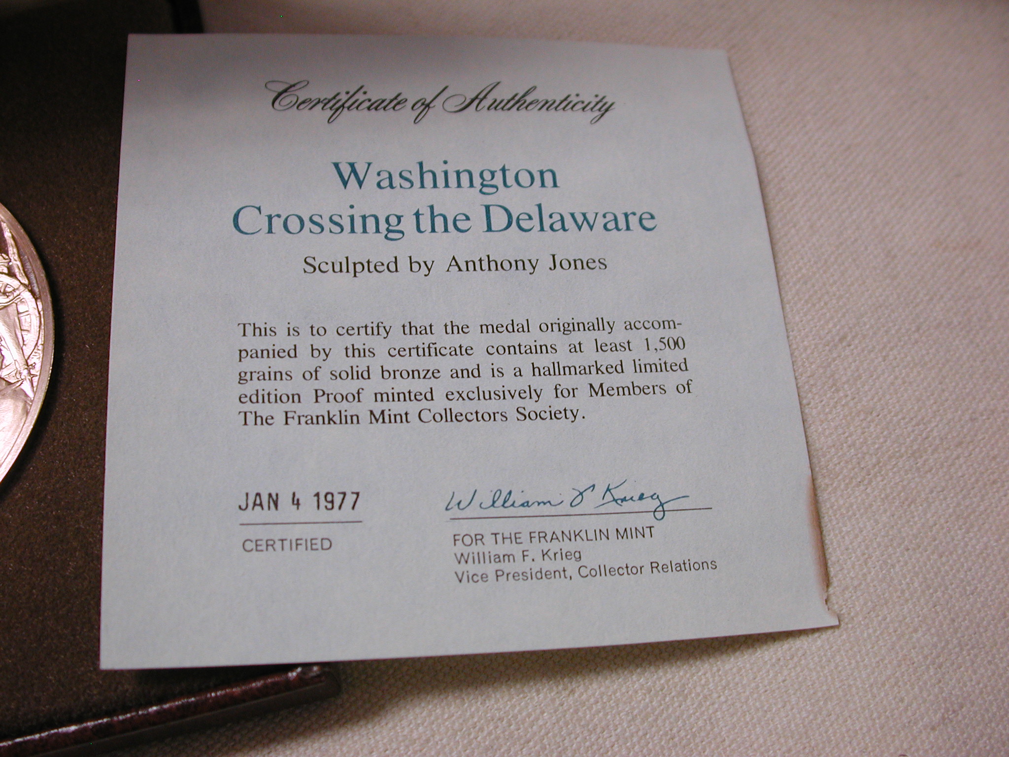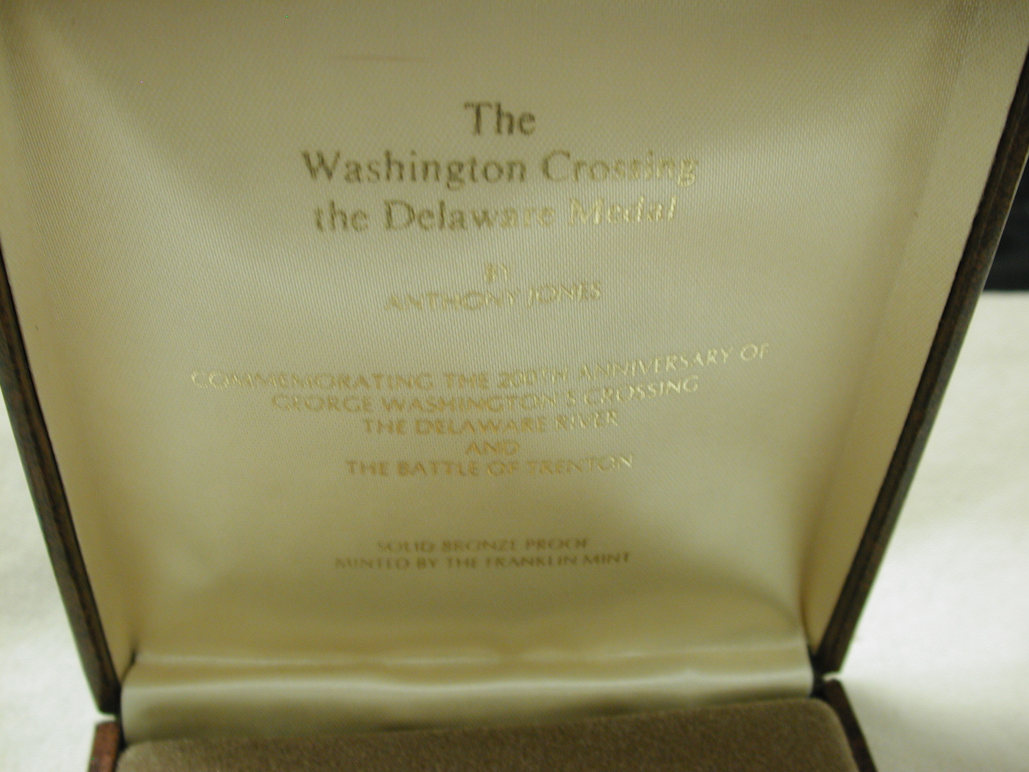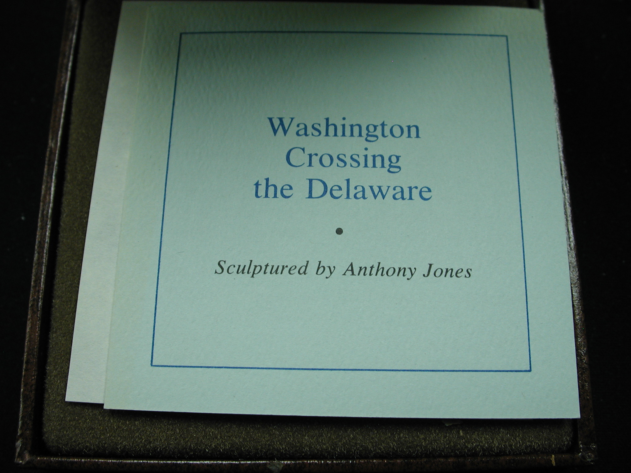 Washington Crossing the Delaware Anthony Jones Sculptor Franklin Mint Medal with box and papers – sculpted in solid bronze and measure 2.25 inches round.