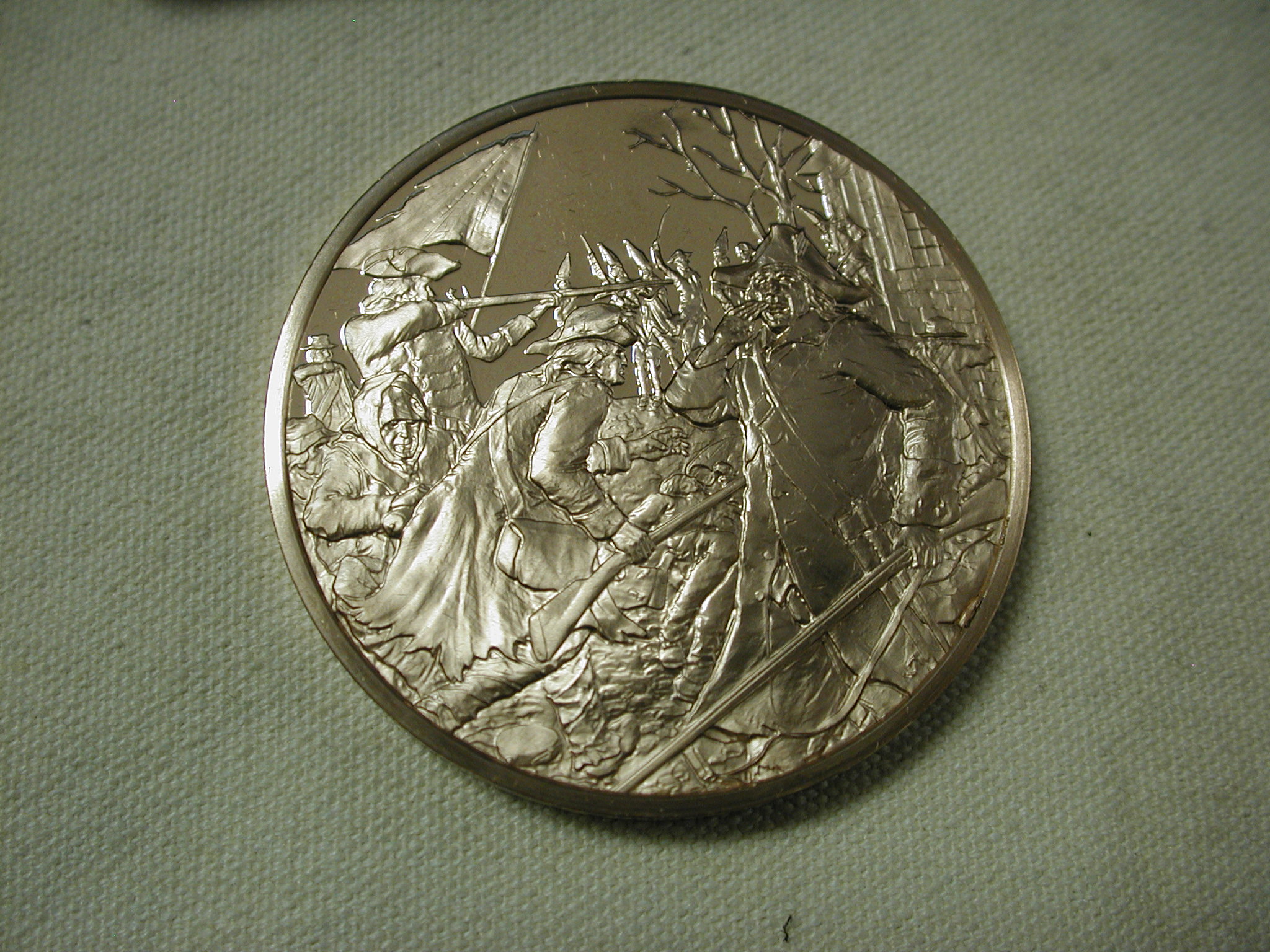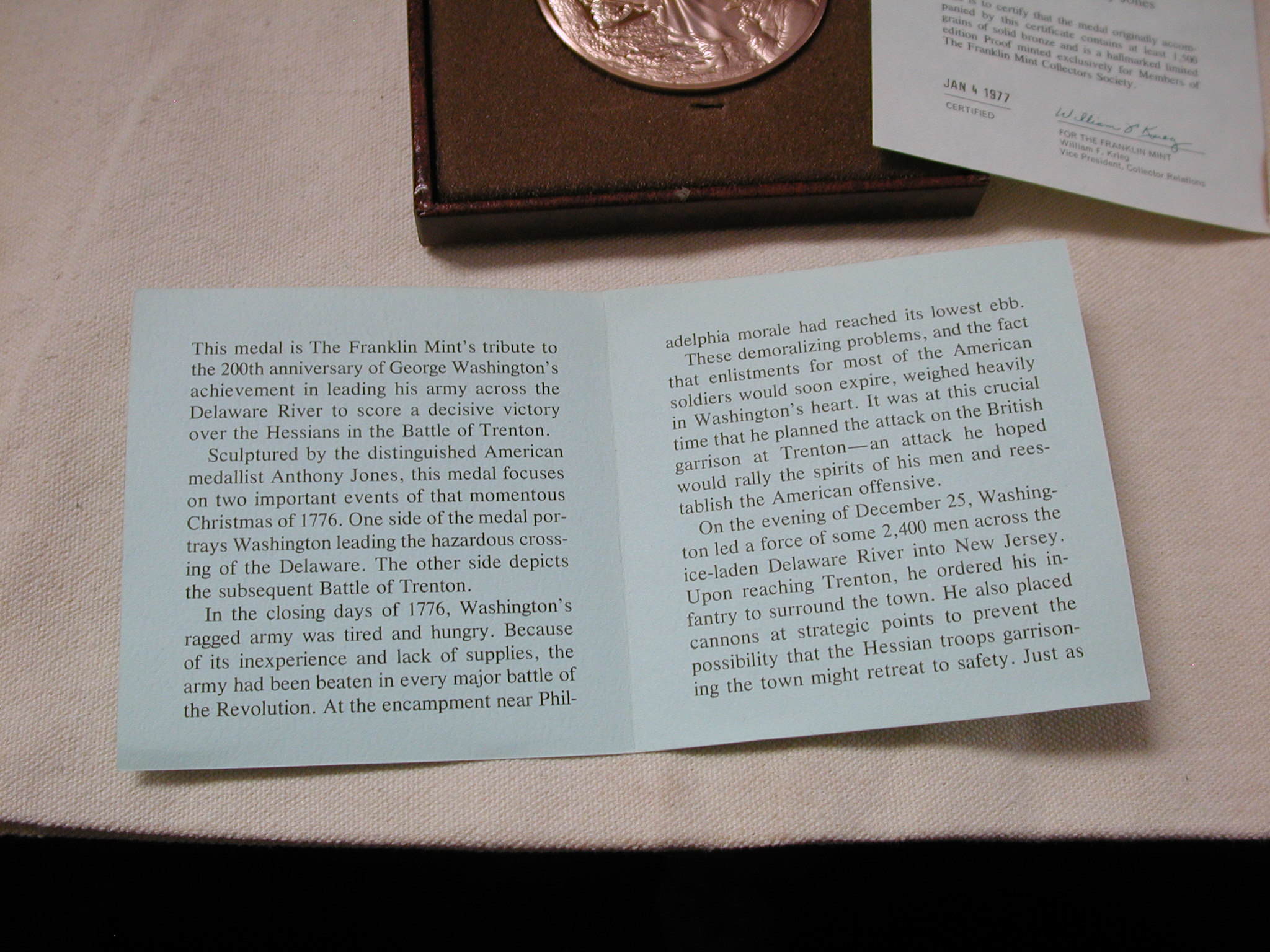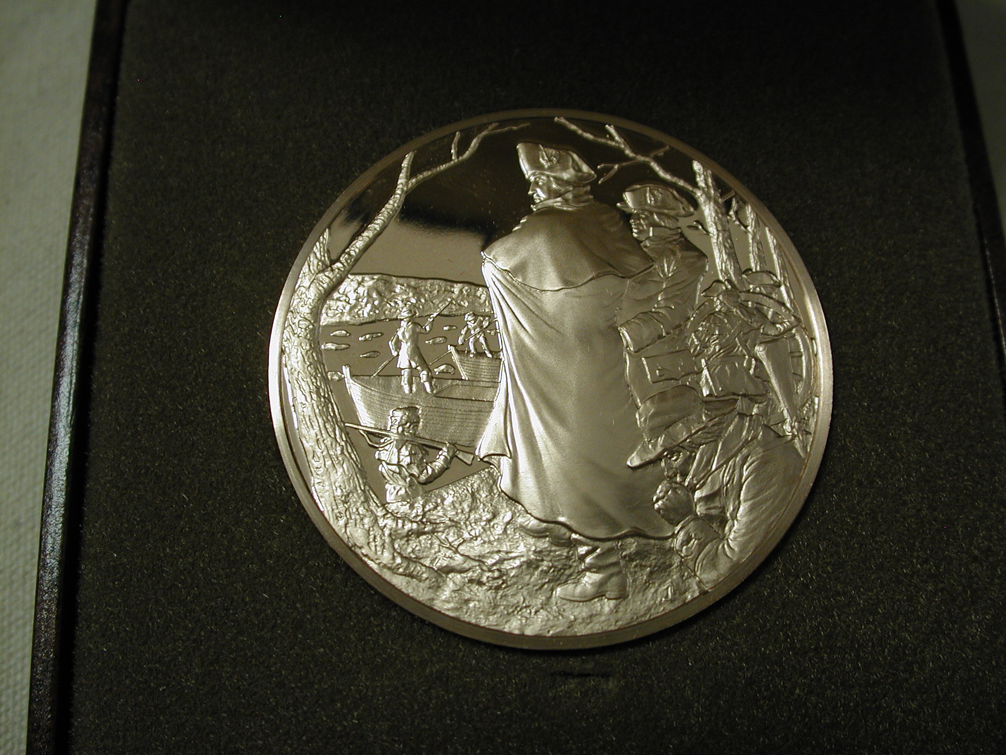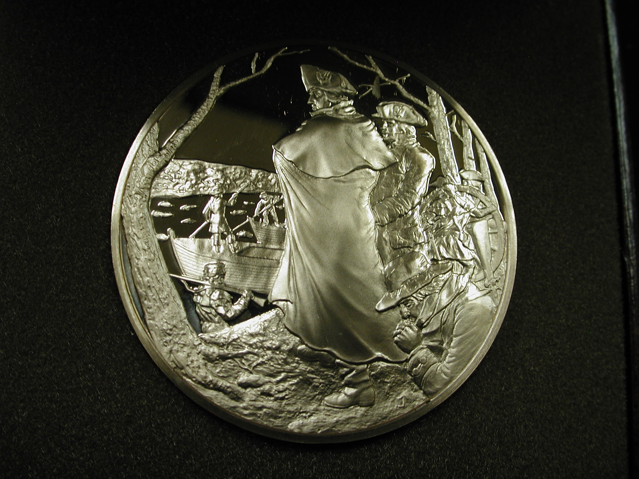 Washington Crossing the Delaware Anthony Jones Sculptor Franklin Mint Medal with box and papers – sculpted in solid bronze and measure 2.25 inches round.