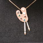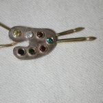 some history – When Malcolm was alive he collaborated with master jeweler Pietro Romano in Bellport and created a line of jewelry. An artist’s palette modeled after the palette used by Malcolm was also created in 18KT gold using colored diamonds. A pendant with matching earrings were crafted. In addition paintbrush earrings and pendant were also created based on Malcolm’s actual paintbrushes used. A hot air balloon brooch was created as well as bi-plane cufflinks.